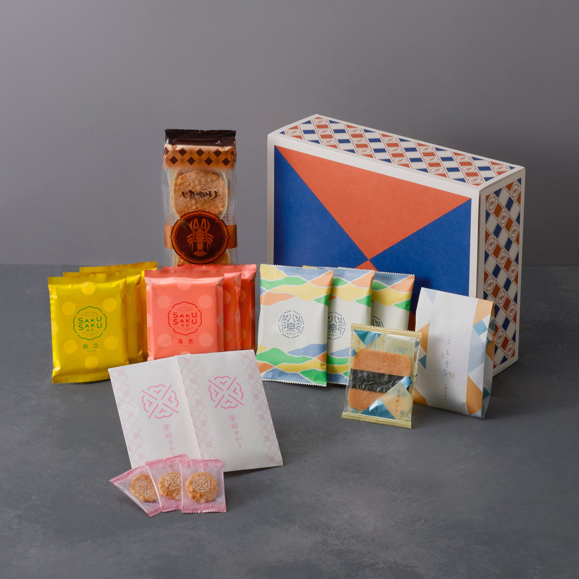 這盒禮盒就像是一個「海老煎餅博物館」,您可以品嚐到不同口感與風味的日式蝦餅: