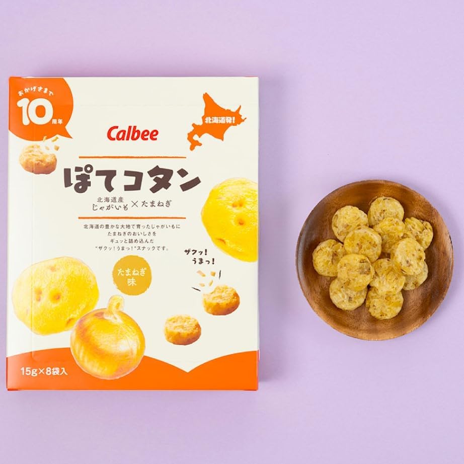 Calbee (卡樂B) 北海道限定的隱藏版名物!這款「Potekotan (ぽてコタン) 洋蔥薯餅」與薯條三兄弟系出同門,但口感截然不同。嚴選100% 北海道產薯仔與洋蔥,切碎後混合壓製成一口大小的圓餅。入口能聽到「Zaku」一聲的硬脆口感,隨即爆發出洋蔥的香甜與薯仔的濃郁風味,是讓人一試難忘的北海道土產。