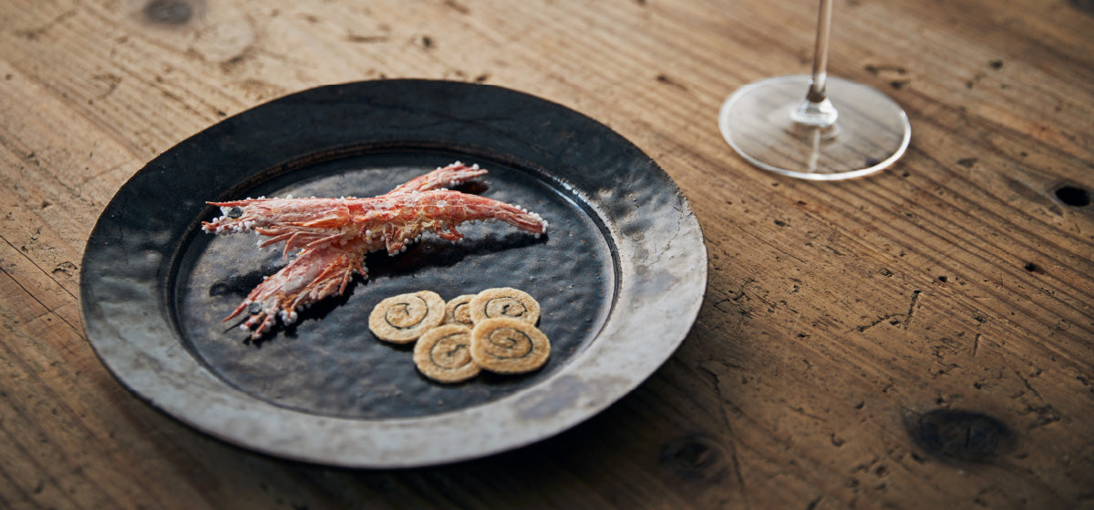 ● 牡丹海老姿燒 (1杯):內含 2 枚 壓製成形的牡丹海老。將鮮甜的牡丹蝦壓至極薄,鎖住濃郁的蝦膏與香氣,視覺上保留了蝦子的華麗姿態。