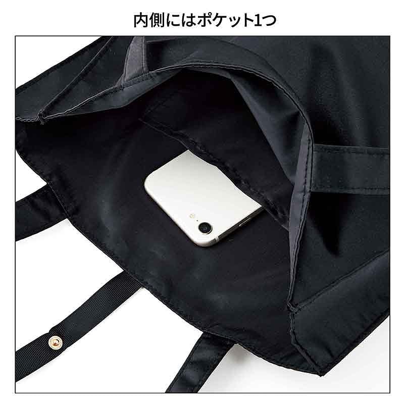 採用散發高級光澤感的亮面緞布材質,配上簡約優雅的設計。肩帶長度適中,方便上膊肩揹。內設 1 個小口袋,並擁有 5cm 的底寬,足以放入電子配件甚至縮骨遮等日常必需品。手提袋亦可摺疊收納,作為備用環保袋帶出街。