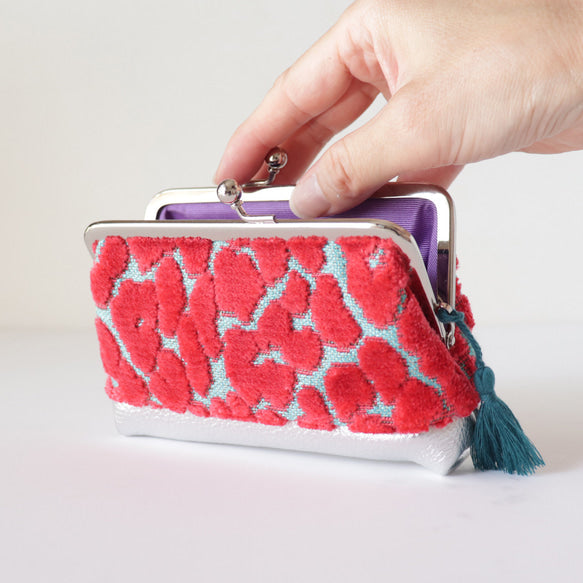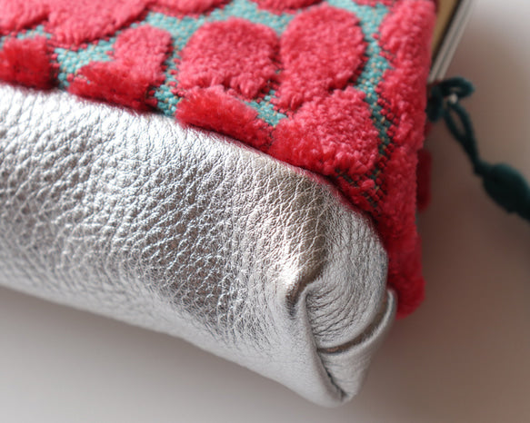 使用從美國直送的豹紋ベルベット(天鵝絨)面料,搭配鮮明的 Turquoise × Hot Pink 配色,視覺效果亮眼卻不失質感。外側結合日本製箔貼銀色牛革,隨著光線角度變化,呈現細膩光澤,是一款拿在手上就讓心情變好的特別單品。