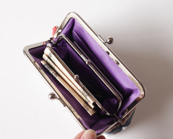 親子がま口結構,內側小口金可放零錢,外層空間則可收納卡片與對摺紙幣。尺寸雖為手掌大小,卻具備出乎意料的收納力,日常外出、午休買咖啡或帶一個小包出門都非常方便。