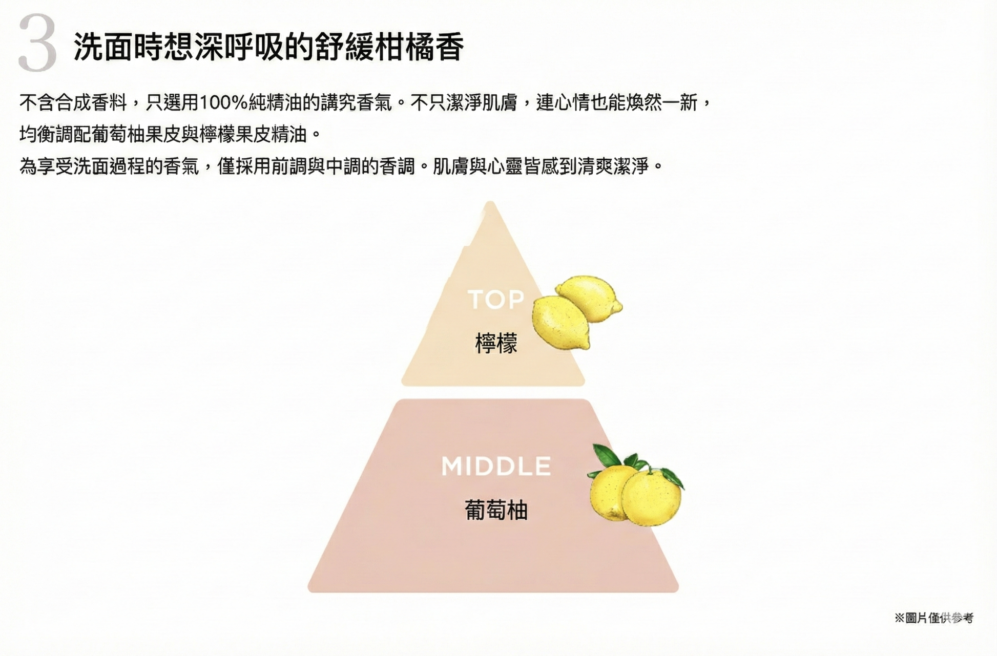 - 療癒柑橘香氣:100% 天然精油調配(西柚及檸檬果皮油),無合成香料,讓潔面時刻充滿清新放鬆的氣息。