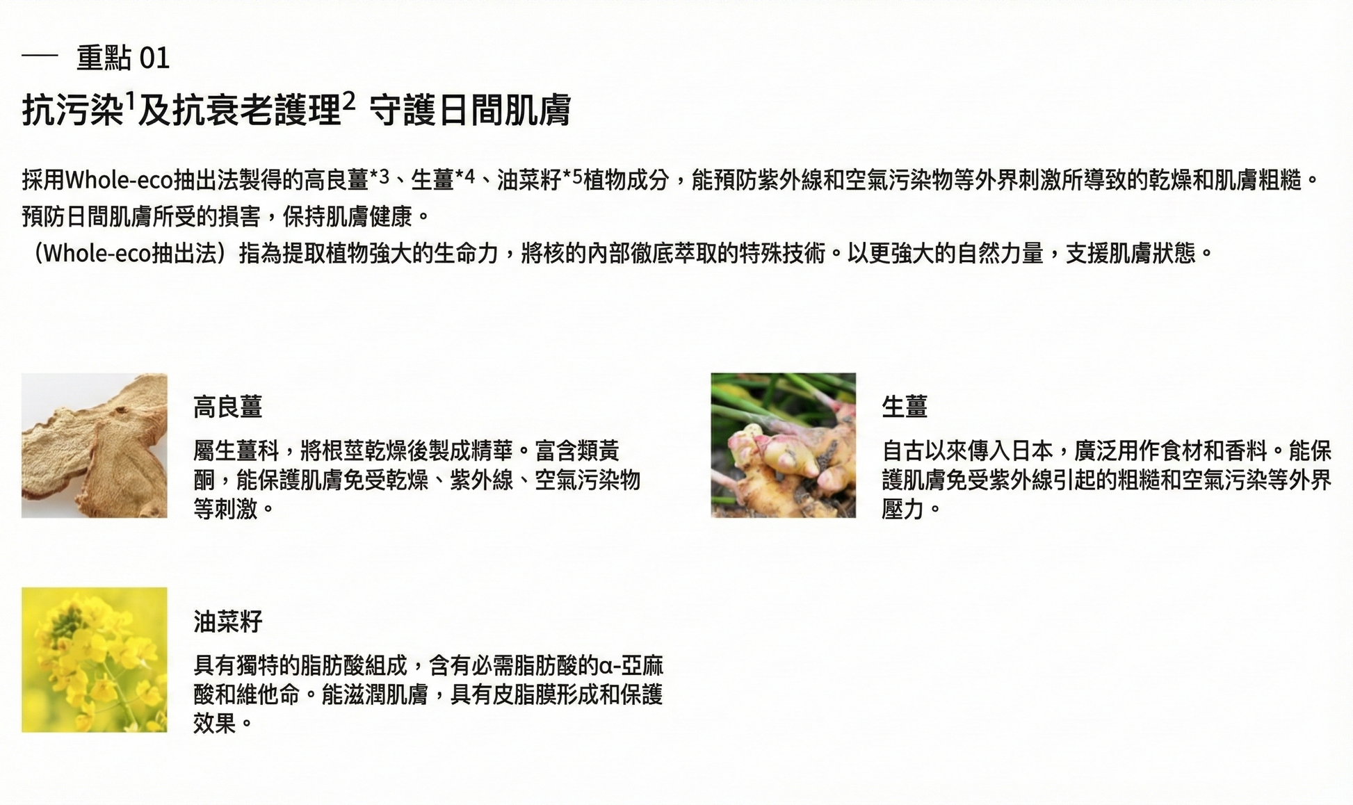 配方具抗污染(Anti-Pollution)與抗老化護理功能,採用 Whole-eco 抽出法取得的植物成分(高麗根、薑根、油菜籽),有助抵禦紫外線及大氣污染等外在刺激,減少乾燥及肌膚不適,維持健康柔嫩膚況。