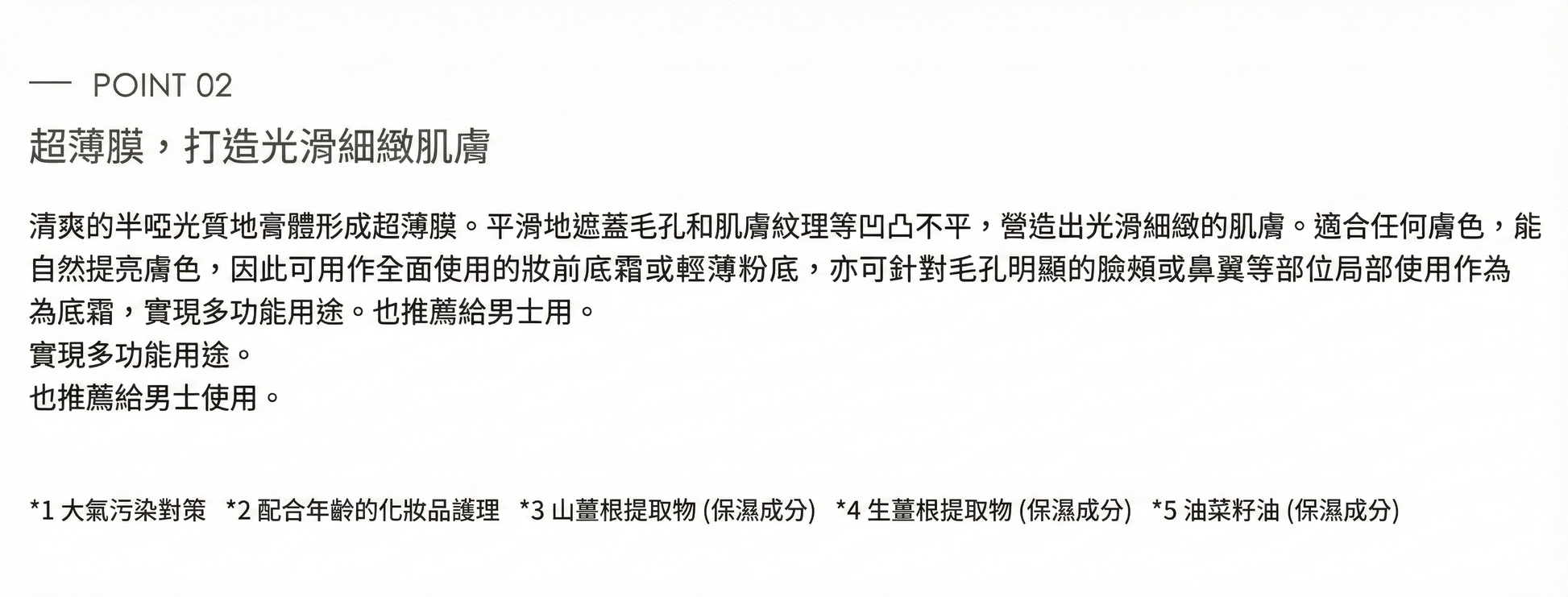質地呈半啞光(Semi-Matte),輕薄貼膚,能填平毛孔與肌理不均,自然提升膚色並保留肌膚呼吸感。色調自然、容易融合任何膚色,適合作為底妝、輕粉底或局部遮瑕同時兼顧防曬效果。