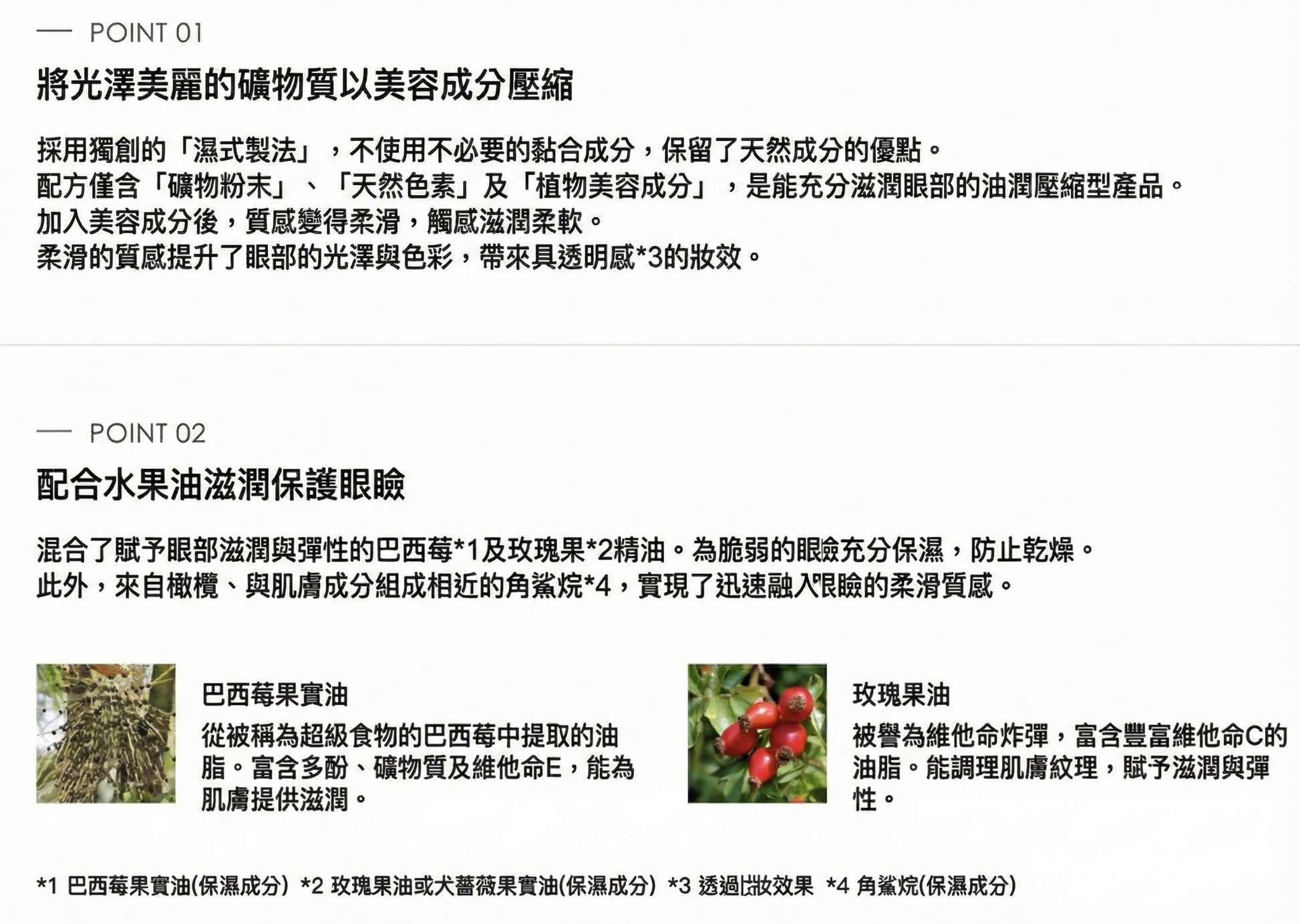 這款礦物保濕眼影採用獨特的「濕式製法」,不使用不必要的黏合劑,將天然礦物粉末、植物美容成分與天然色素直接固化,保留了成分的護膚功效。富含超級水果精油,質地如奶油般柔滑,能滋潤乾燥的眼部肌膚,帶來透明感與光澤感,讓眼妝更貼服持久。