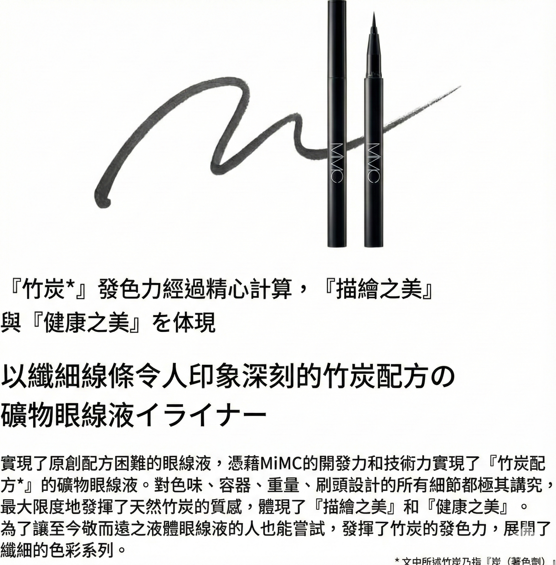 展現「書道之美」與「健康之美」的礦物眼線液。MiMC 挑戰高難度技術,成功研發出以天然「竹炭*1」為顯色基礎的配方。