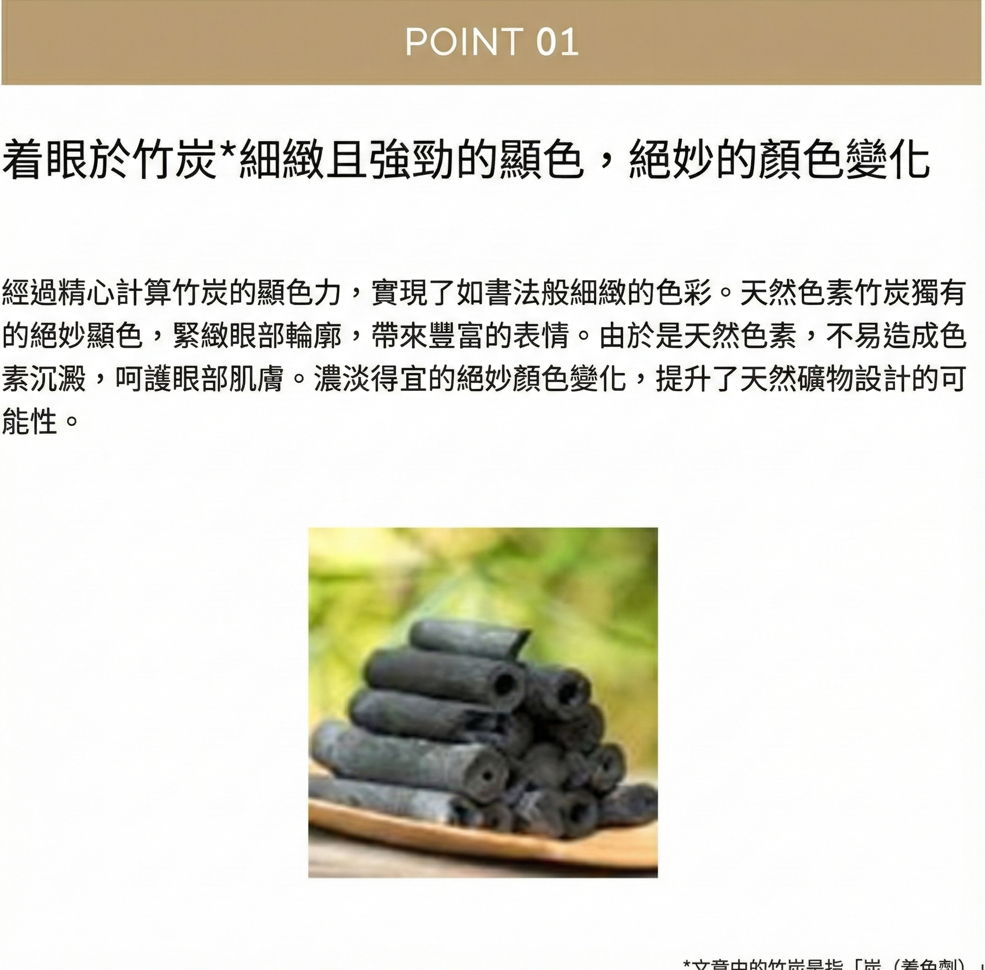 這款眼線液不使用一般合成色素或容易引致色素沉澱的碳黑 (Carbon Black), 而是利用天然竹炭的微細粉末來實現深邃發色。