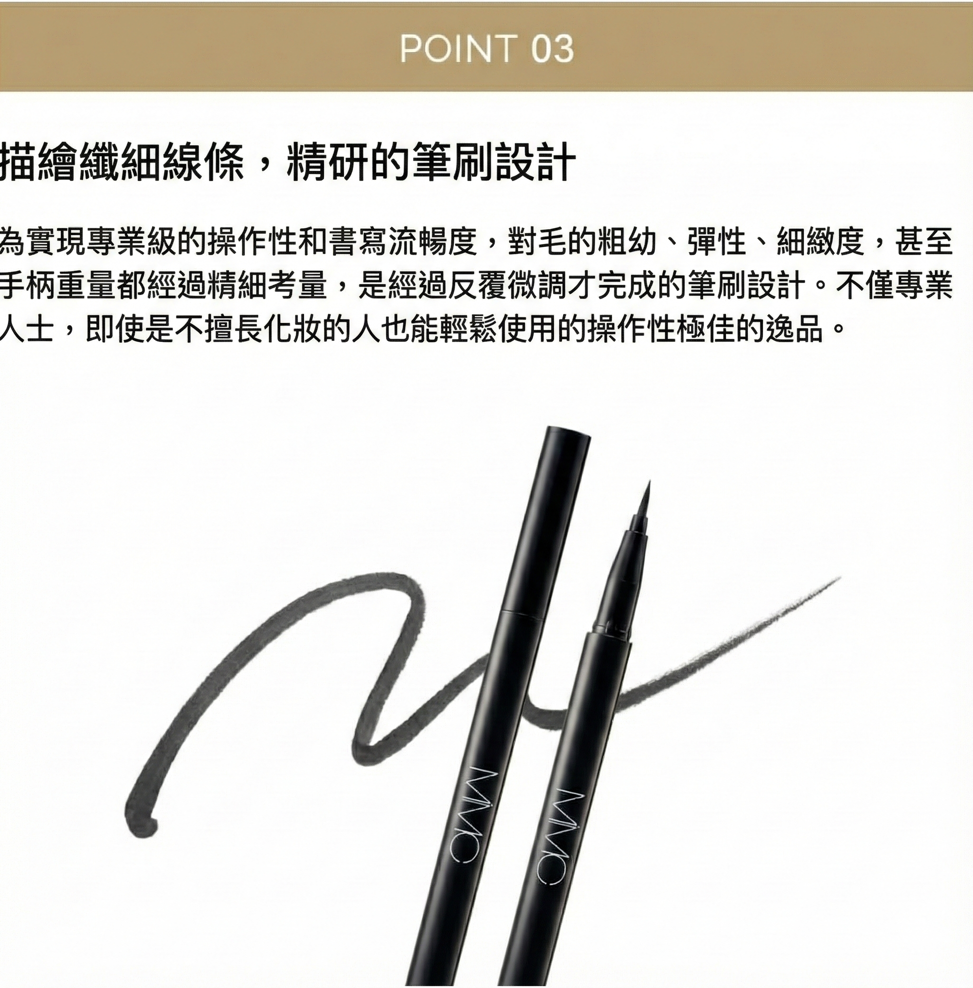 質地水潤流暢,乾燥後呈現自然的啞光色澤。筆觸精準,能隨意描繪極細眼線或大膽貓眼,全日保持乾淨俐落,不易暈染至下眼皮。