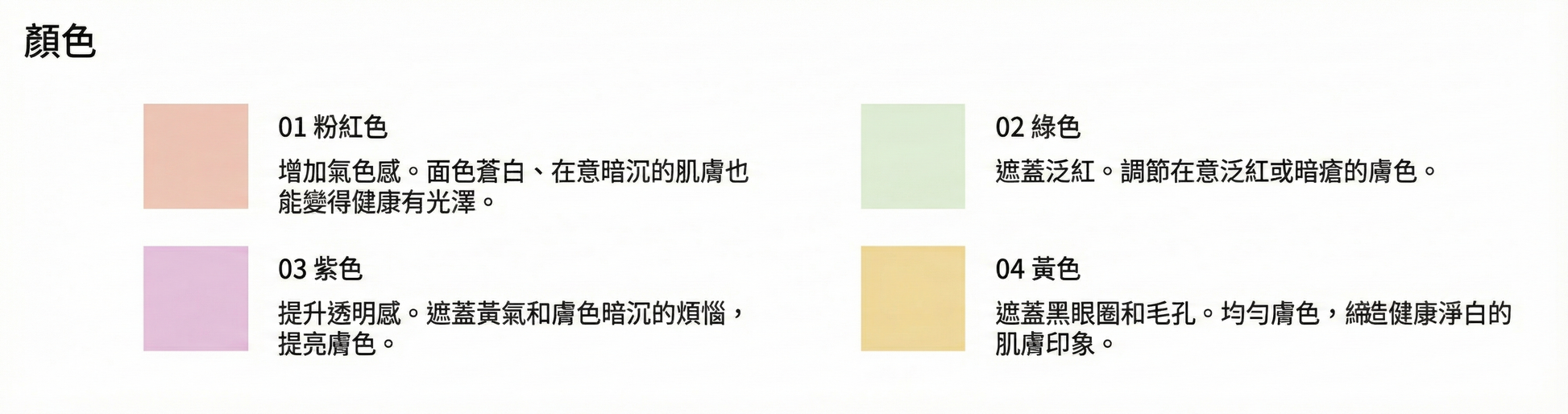 多功能遮瑕膏結合自然遮蓋與妝前修飾效果,可修飾毛孔、膚色不均及局部瑕疵,並具基本防曬保護。質地柔滑易推,貼合肌膚並提升底妝貼服度,適合日常妝容。