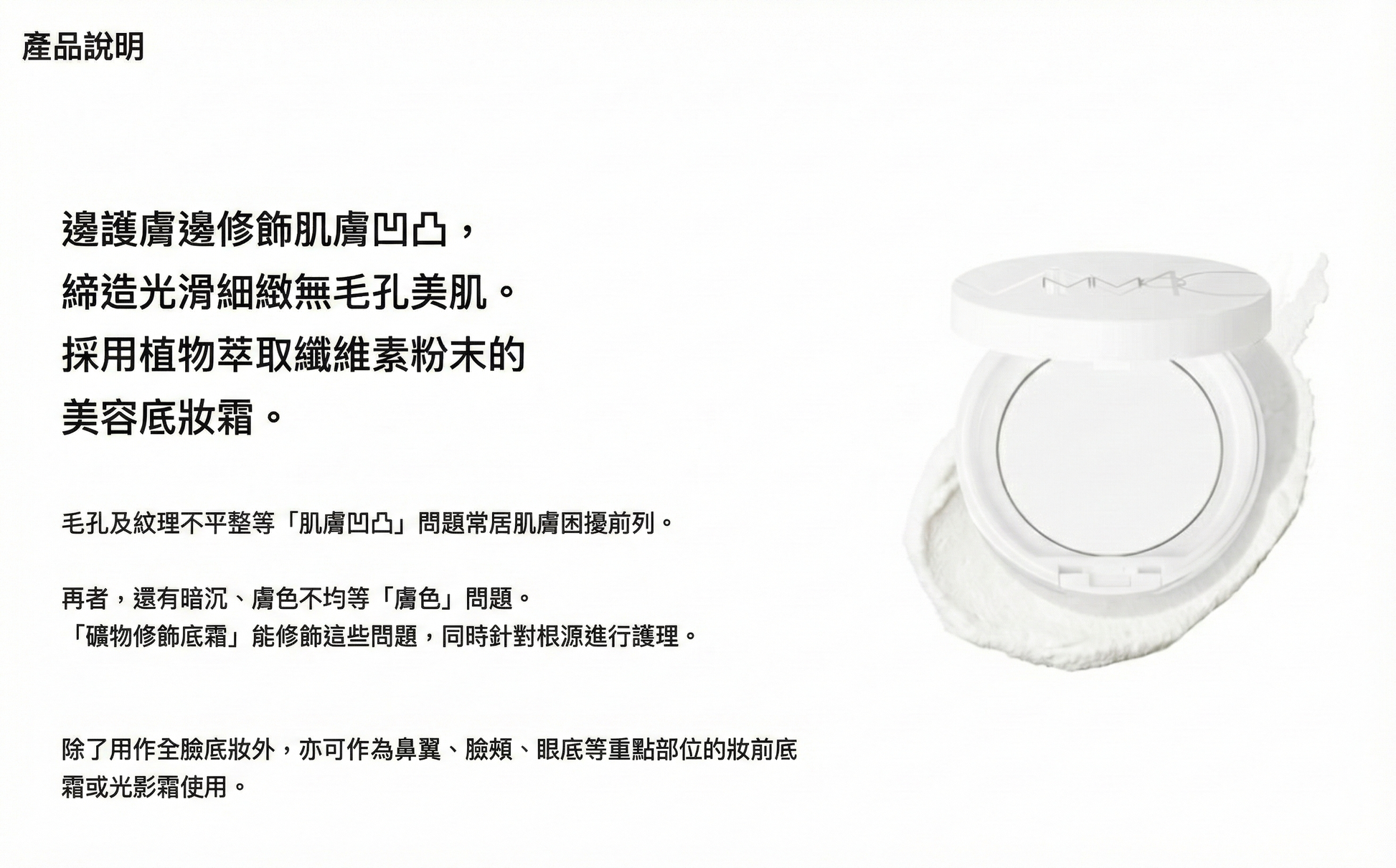 MiMC 礦物無瑕遮瑕膏結合護膚與底妝打底功能,採用植物由來的結晶纖維素粉末,能柔滑填平毛孔與肌理不均,打造自然平滑無瑕妝感。同時作為化妝下地使用,可提升粉底貼服度與持妝效果。