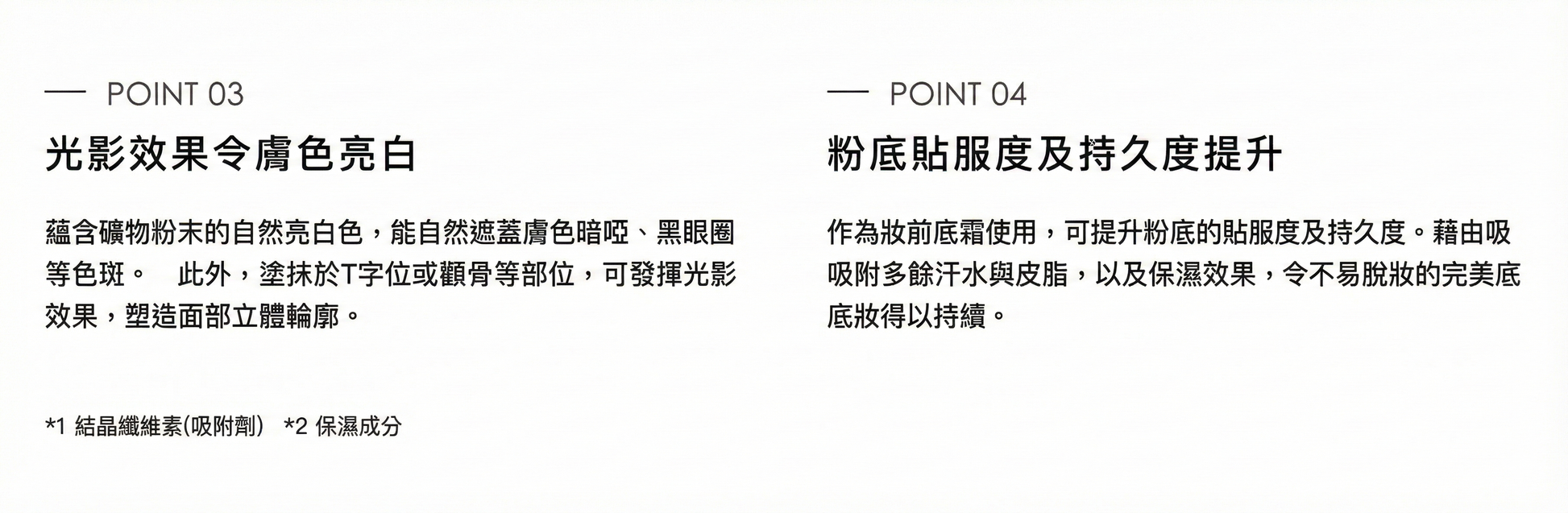 - 遮蓋毛孔與細紋等肌膚凹凸不平問題,塑造平滑妝面基礎。