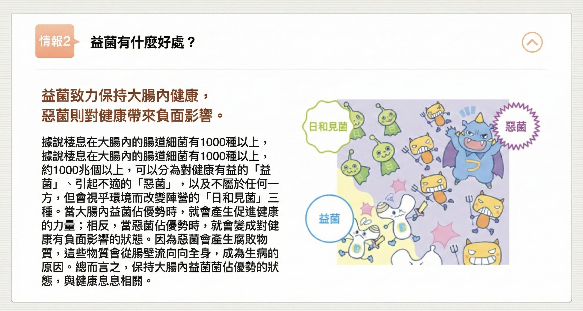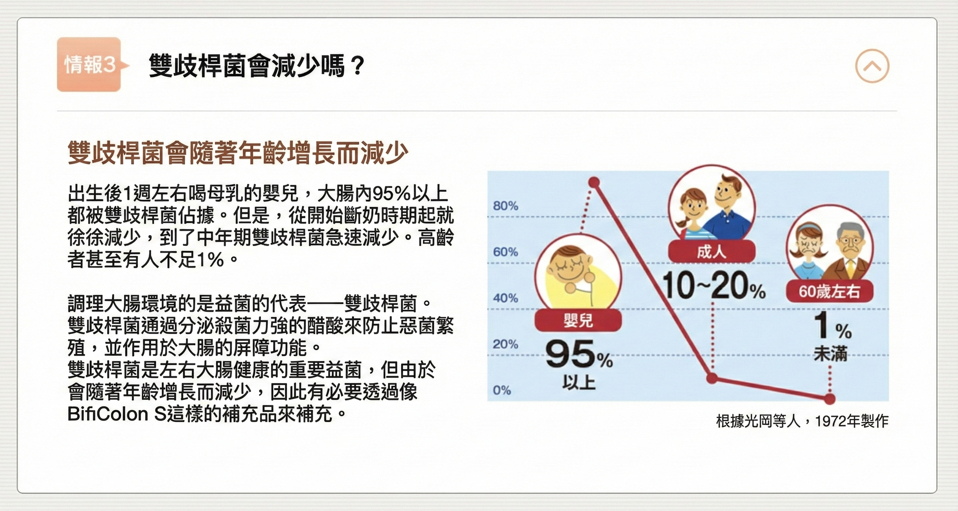 在大腸內的「好菌」之中,約 99.9% 由比菲德氏菌(ビフィズス菌)組成。