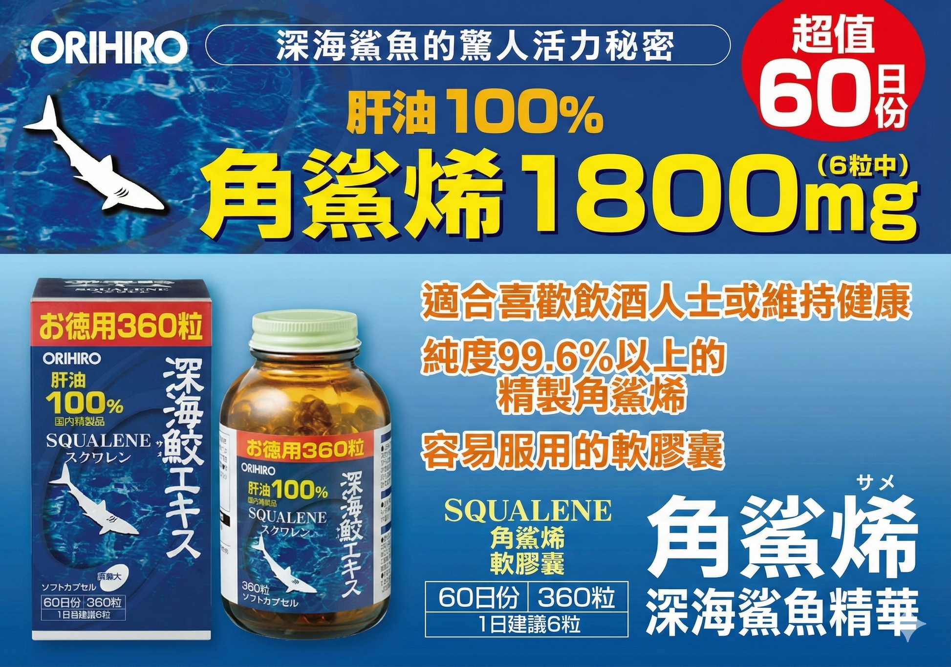 使用由深海鯊魚肝油提煉、純度達 99.6%以上 的精製角鯊烯,製成易於吞服的軟膠囊配方,方便每日保健服用。一樽約 2個月份量,適合關注日常元氣及體質管理的人士。