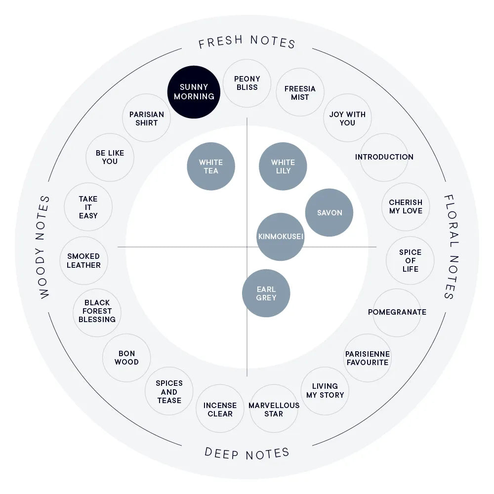 一款清新花香調香水,讓人彷彿置身清晨,神清氣爽。依蘭和晚香玉等馥鬱花香,與淡雅果香交織融合。明亮清新的葡萄柚和黑醋栗,與檀香、麝香和琥珀的舒緩甜香完美融合。