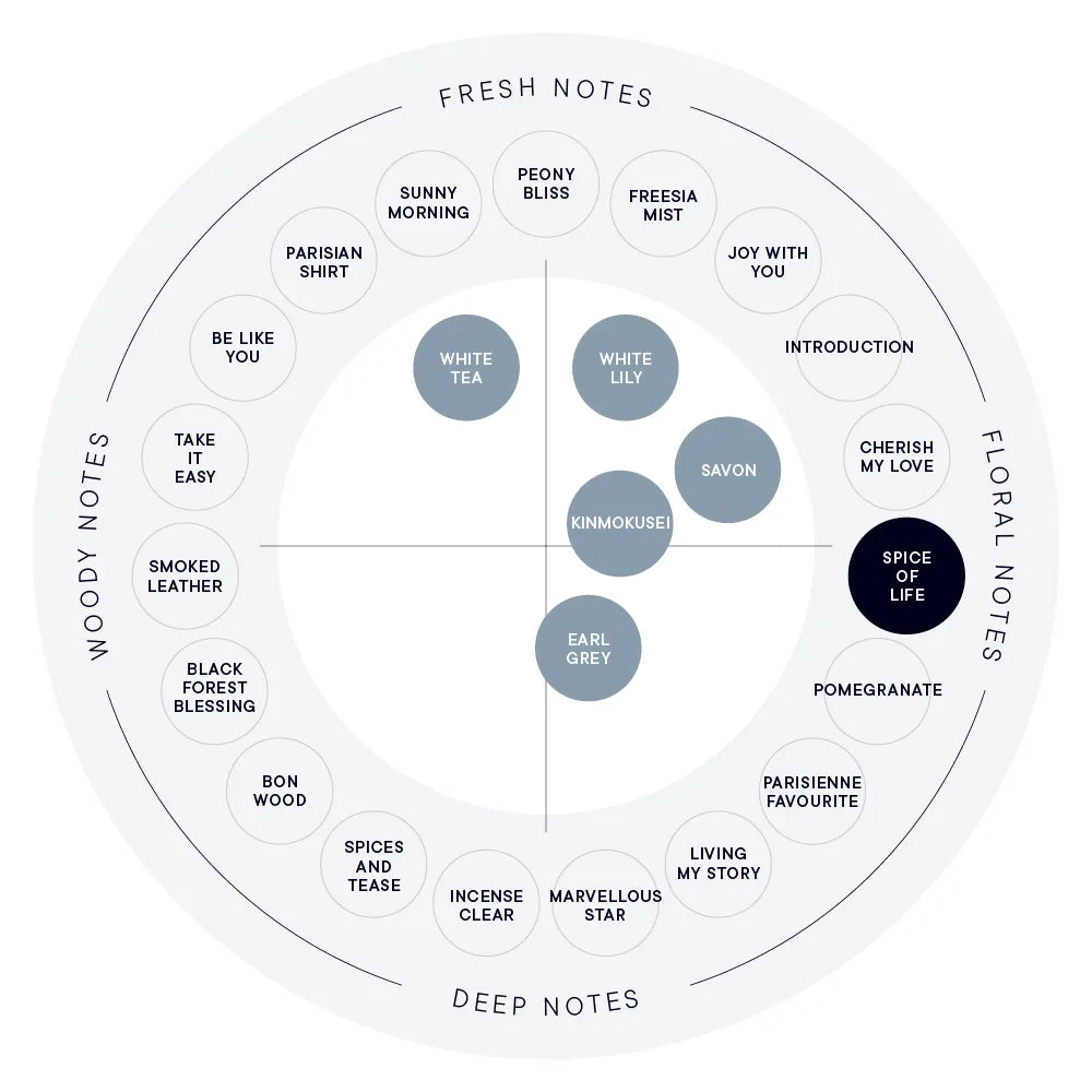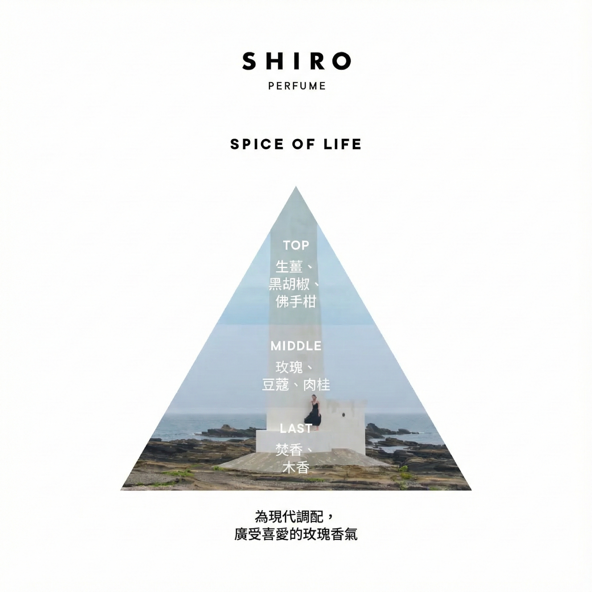 一款令人印象深刻的香味,宛如優雅的玫瑰在生薑和荳蔻的辛香中嬌艷綻放。散發著略帶成熟的花香,甜度適中,並帶有辛香料的獨特氣息。